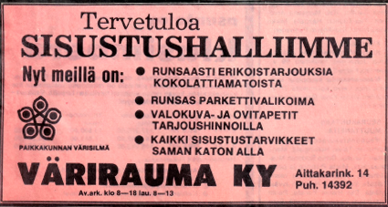 Värirauman tarina sai alkunsa 1. huhtikuuta 1969, kun Anssi Lainio perusti Rauman Väri Ky:n. Toiminta alkoi Kuninkaankadulta, Koskelan talon 30 neliön tiloista, jolloin tavoitteena oli laajentaa maalausurakointia myös maalien ja tapettien myyntiin. Pienet tilat jäivät nopeasti kasvun jalkoihin, ja matka jatkui omien toimitilojen kautta Aittakarinkadulle vuonna 1977. Tuolloin yritys sai nimen, josta meidät tänä päivänä tunnetaan: Värirauma.
